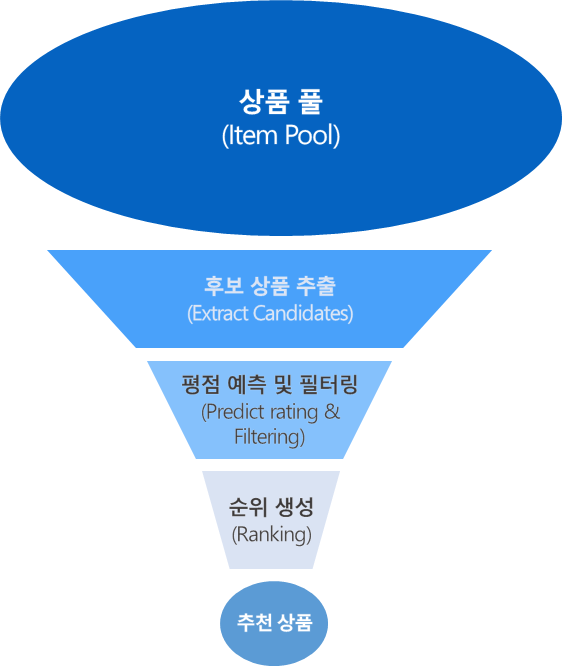 추천시스템은 대상 상품들에서 후보 상품을 추출합니다. 그 후 추출된 상품에 대해 예측이나 필터링을 수행하고, 그 결과에 기초해 상품 순위를 매깁니다.