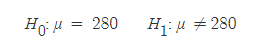 귀무가설은 "모평균은 280이다"이고, 대립가설은 "모평균은 280이 아니다"로 양측검정을 이용합니다.