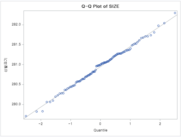 (좌) 그래프는 관측된 표본의 분포를 나타낸 것입니다. 표본 분포를 살펴보면 정규분포와 유사한 것을 확인할 수 있습니다. (우) 그래프는 Q-Q Plot으로 각 관측치들이 대각선을 크게 벗어나지 않으면 정규성 가정을 만족한다고 볼 수 있습니다. 물론, 제일 정확한 것은 정규성 검정을 해보는 거겠지만 기왕 [TTEST] 절차를 수행하면 나오는 결과물을 통해 보는 것이 더 편하기 때문에 살펴봤습니다.