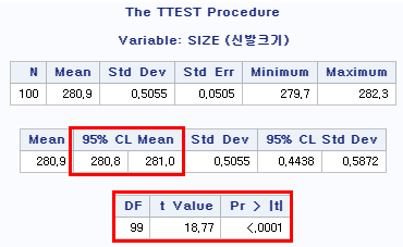 [TTEST] 절차를 통한 출력 결과입니다. [TTEST] 절차는 기본 기술통계량, 신뢰구간 그리고 가설 검정에 대한 p-value를 출력해 줍니다. 평균의 신뢰구간을 살펴보면 [280.8, 281.0]으로 280을 포함하고 있지 않은 것을 알 수 있습니다. 또한 p-value를 살펴보면 P-value<.0001로 유의수준 0.05 하에서 귀무가설이 기각임을 확인할 수 있습니다.