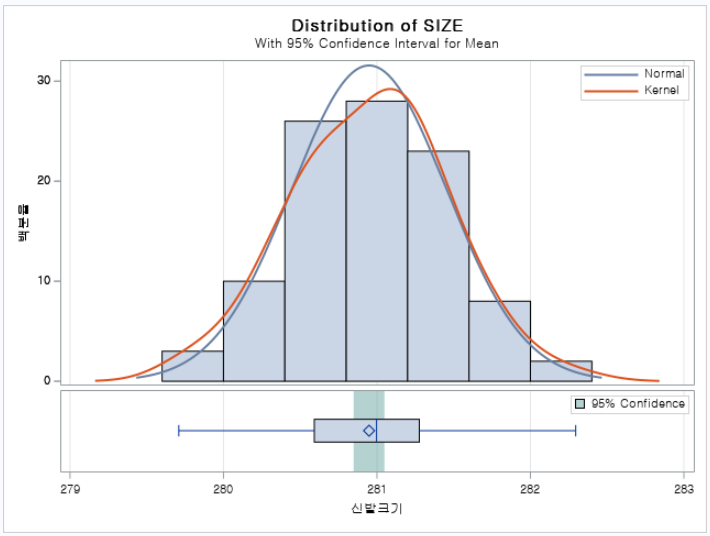 [TTEST] 절차를 통한 출력 결과입니다. [TTEST] 절차는 기본 기술통계량, 신뢰구간 그리고 가설 검정에 대한 p-value를 출력해 줍니다. 평균의 신뢰구간을 살펴보면 [280.8, 281.0]으로 280을 포함하고 있지 않은 것을 알 수 있습니다. 또한 p-value를 살펴보면 P-value<.0001로 유의수준 0.05 하에서 귀무가설이 기각임을 확인할 수 있습니다.