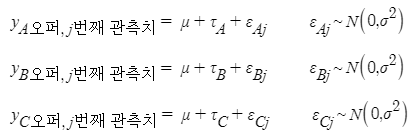 위 모형의 τ(tau; 타우)는 처리(treatment)의 t에 해당하는 그리스어를 따와서 만든 처리효과(treatment effect)를 나타냅니다(실험 계획 번에서 주로 이렇게 사용). 엄청 복잡하게 설명했지만 [예제]에 적용하면 다음과 같이 모형을 세울 수 있습니다.